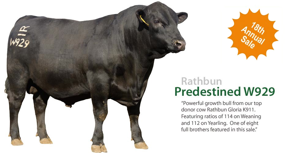 “Powerful growth bull from our top donor cow Rathbun Gloria K911. Featuring ratios of 114 on Weaning and 112 on Yearling. One of eight full brothers featured in this sale.”